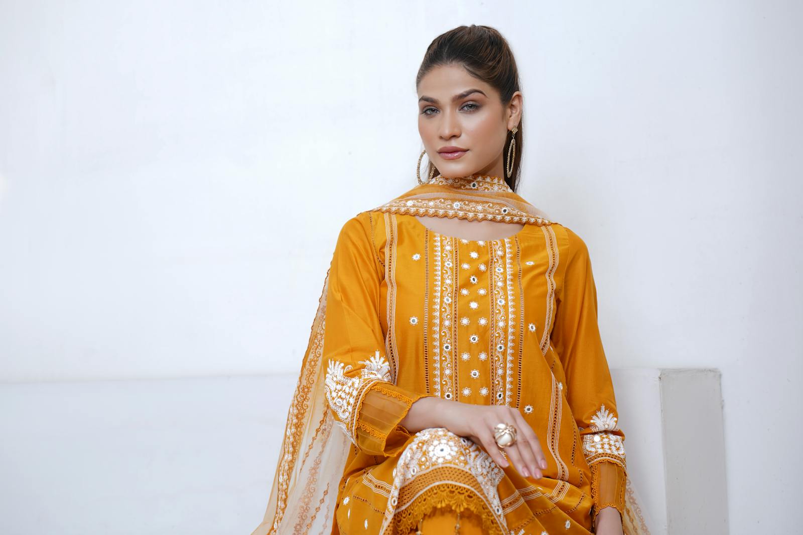Portrait of a woman in vibrant yellow traditional attire, exuding elegance.Rivaaz Churidar Charm