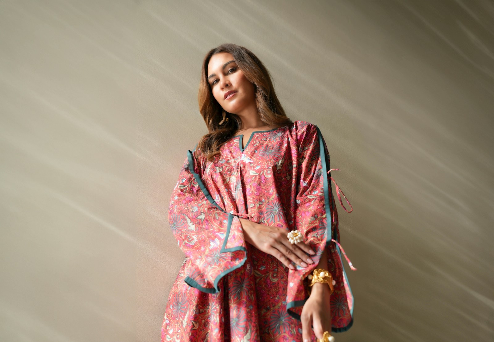 A woman in a pink dress holding a handbagTaruja Rajnita Ensemble